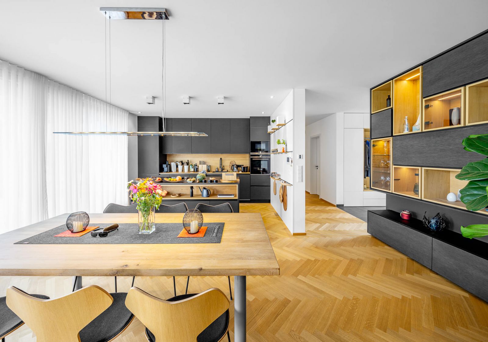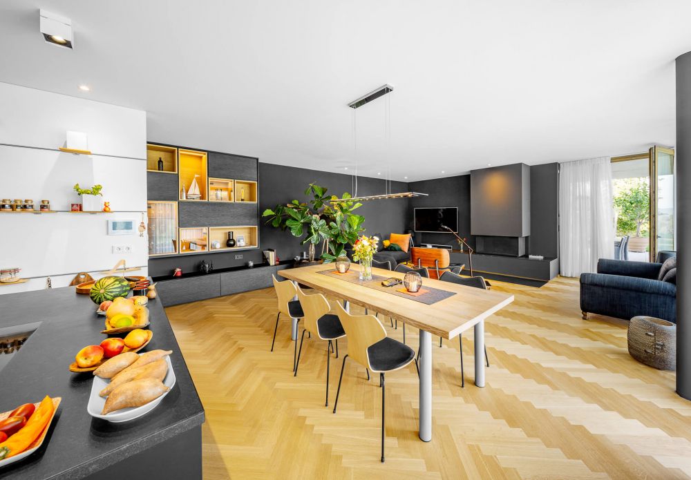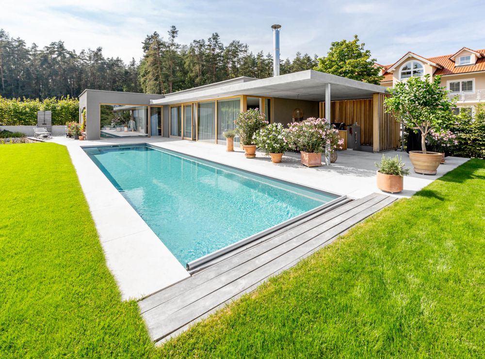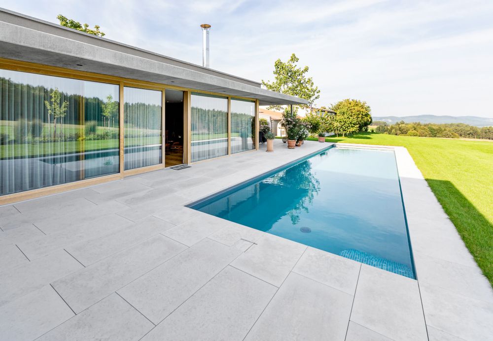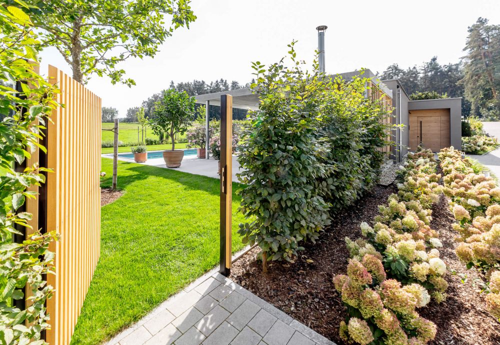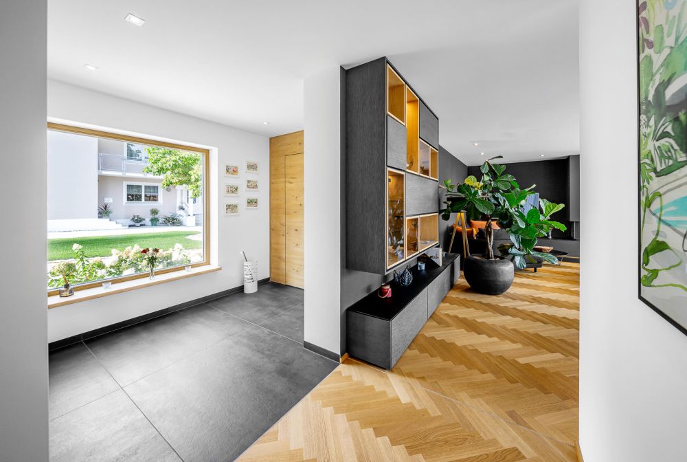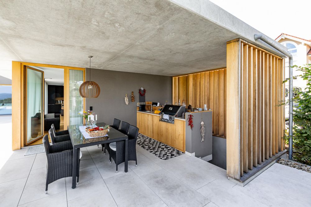 Raumhohe Transparenz mit viel Tageslicht und einer geschützten Terrasse, die den Wohnraum ins Grüne erweitert.