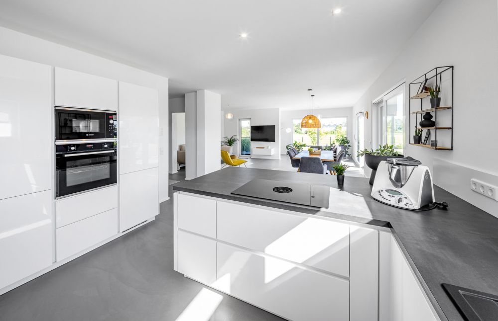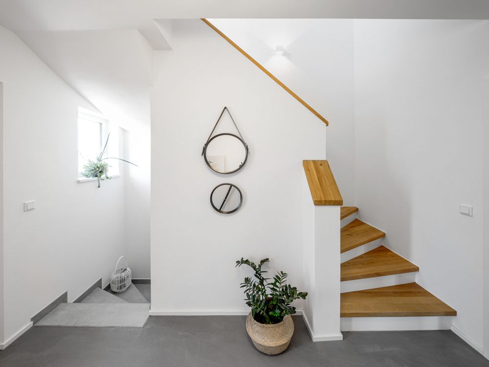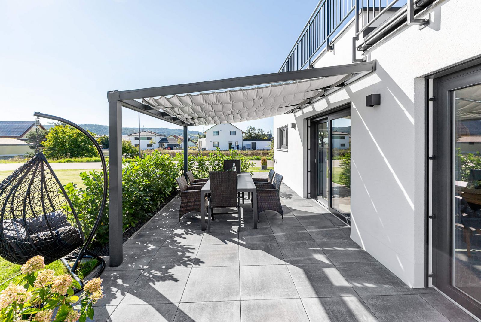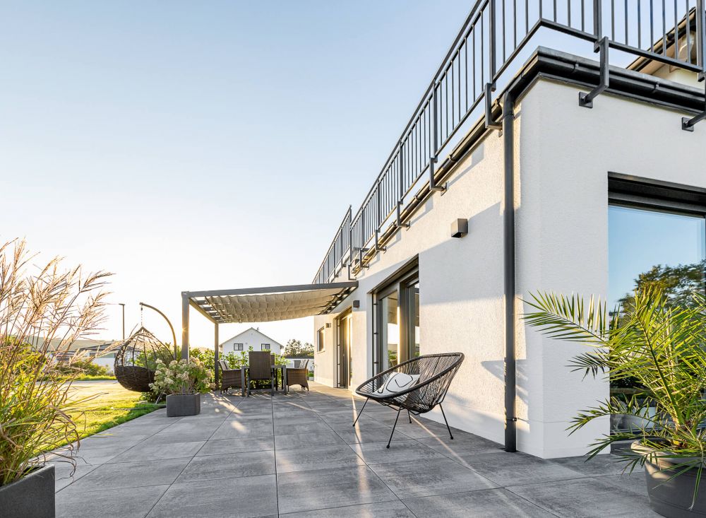 Der raumerweiternde eingeschossige Anbau dient als einladender Ess-Koch- und Wohnbereich. Über zwei große Schiebetüren ist der Zugang zur Terrasse und in den Garten möglich. Das Obergeschoss wurde so konzipiert, dass es jederzeit als separate Einliegerwohnung genutzt werden kann. Durch den unteren Anbau entstand oben eine herrlich große und luftige Dachterrasse als Rückzugsort. Zudem wurde eine Doppelgarage mit angebaut.