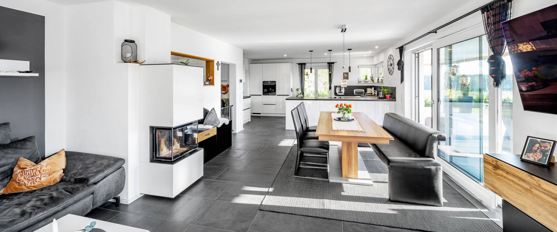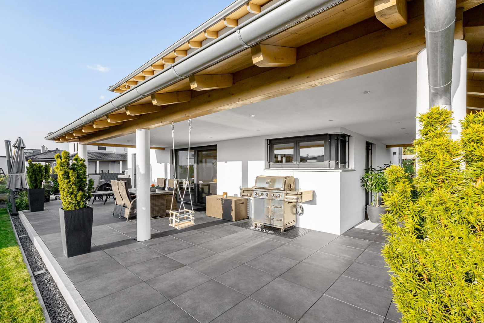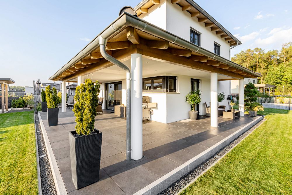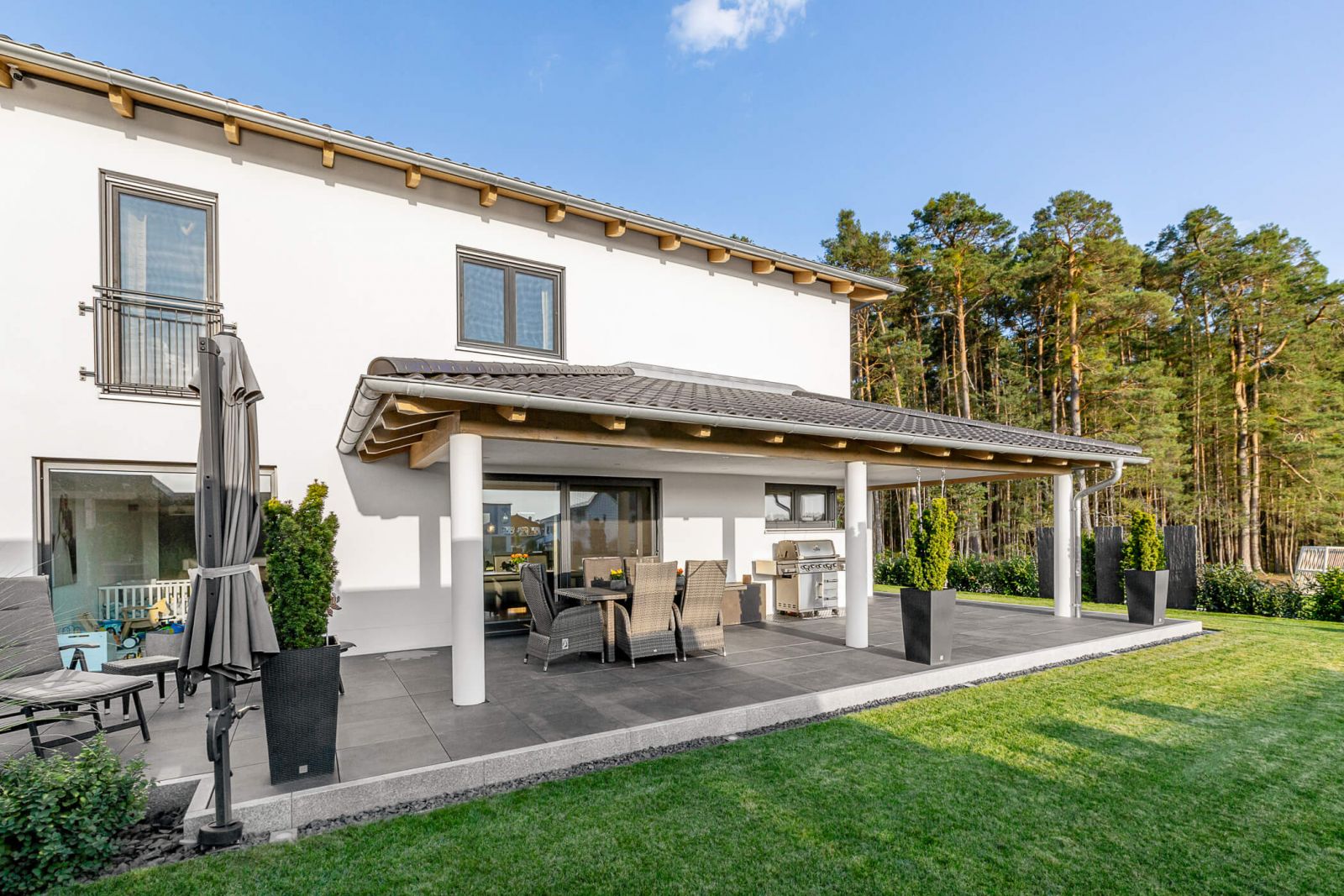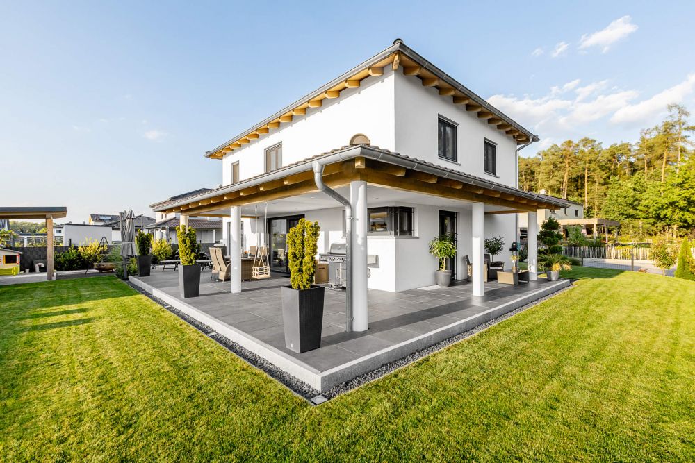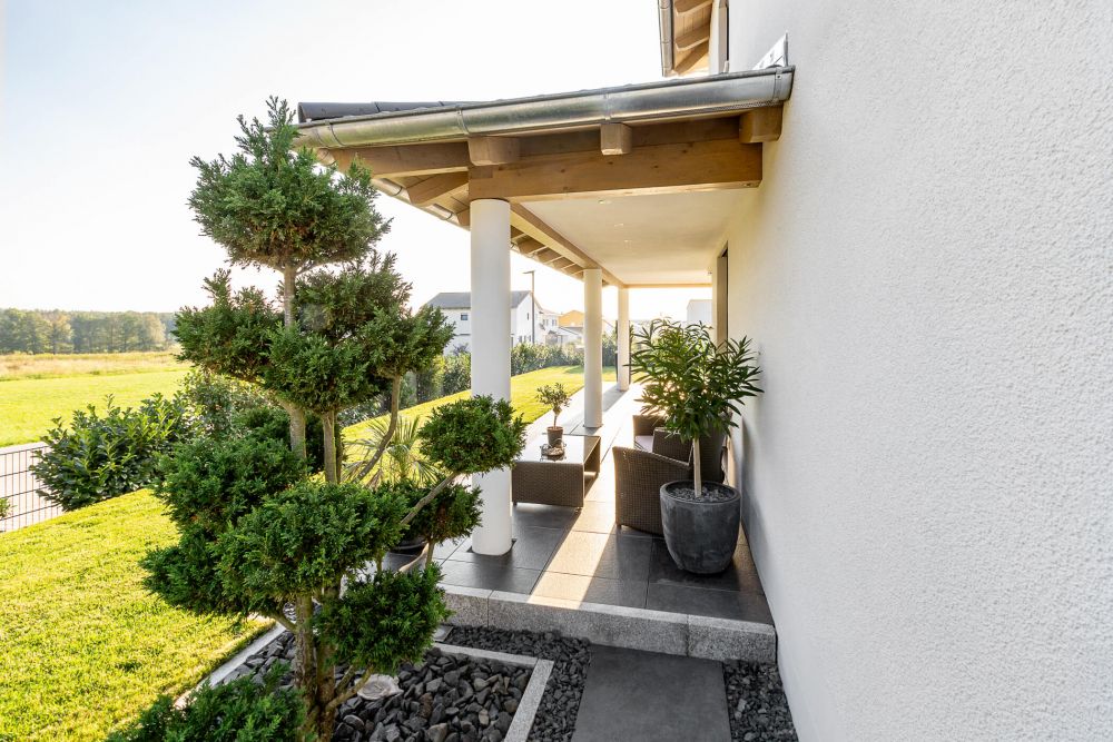 Ein Hauch von Bella Italia in Steinberg am See. Baufamilie E. wünschte sich ein modernes Einfamilienhaus mit großer geschützter Terrasse. Realisiert haben wir eine moderne Toskana-Villa mit Walmdach, die keine Wünsche offen lässt. Die Farben schwarz, anthrazit und weiß dominieren die Optik sowohl innen und außen. Highlight dieses Hauses ist die großzügige angebaute Terrassenüberdachung über zwei Seiten des Hauses, die von Rundsäulen gestützt wird. Gemütliche, laue Sommerabende sind hier garantiert.