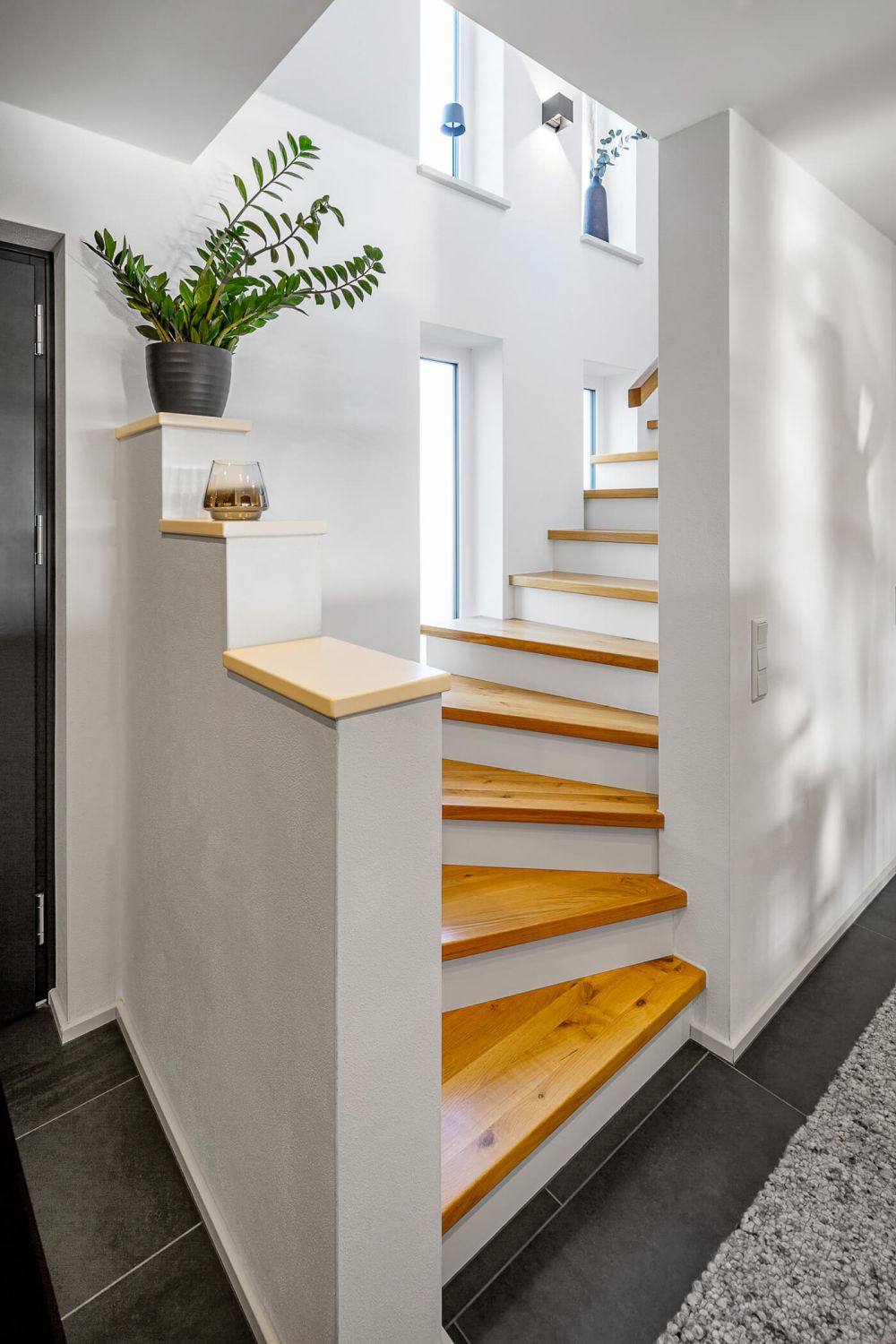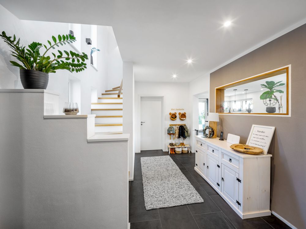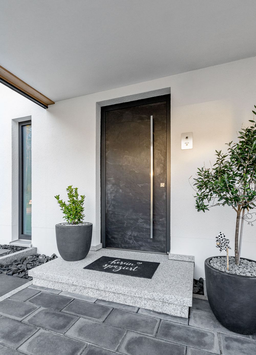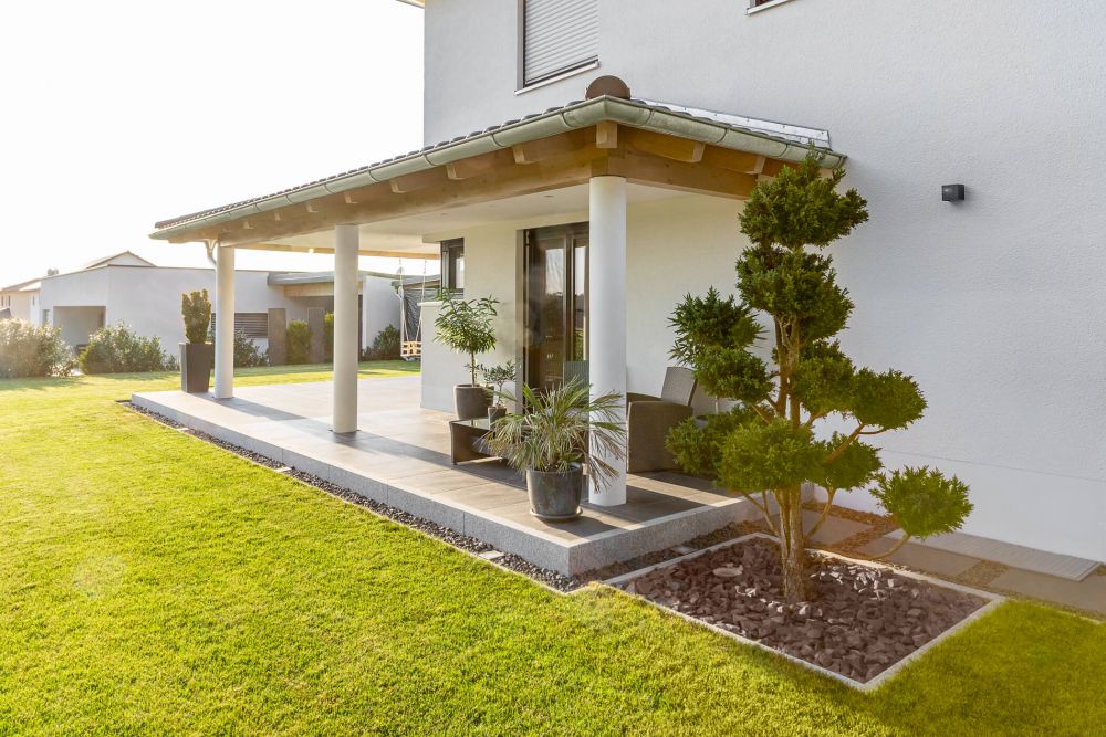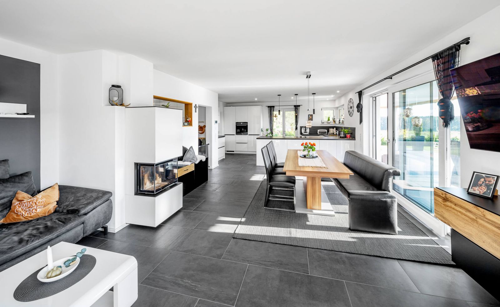 Ein Hauch von Bella Italia in Steinberg am See. Baufamilie E. wünschte sich ein modernes Einfamilienhaus mit großer geschützter Terrasse. Realisiert haben wir eine moderne Toskana-Villa mit Walmdach, die keine Wünsche offen lässt. Die Farben schwarz, anthrazit und weiß dominieren die Optik sowohl innen und außen. Highlight dieses Hauses ist die großzügige angebaute Terrassenüberdachung über zwei Seiten des Hauses, die von Rundsäulen gestützt wird. Gemütliche, laue Sommerabende sind hier garantiert.