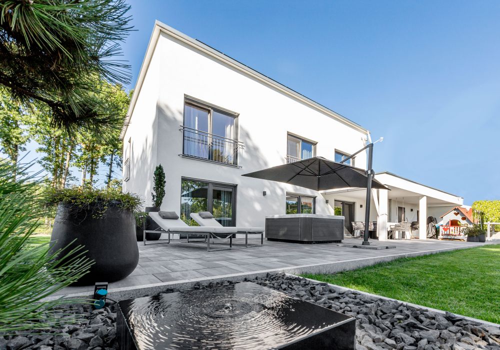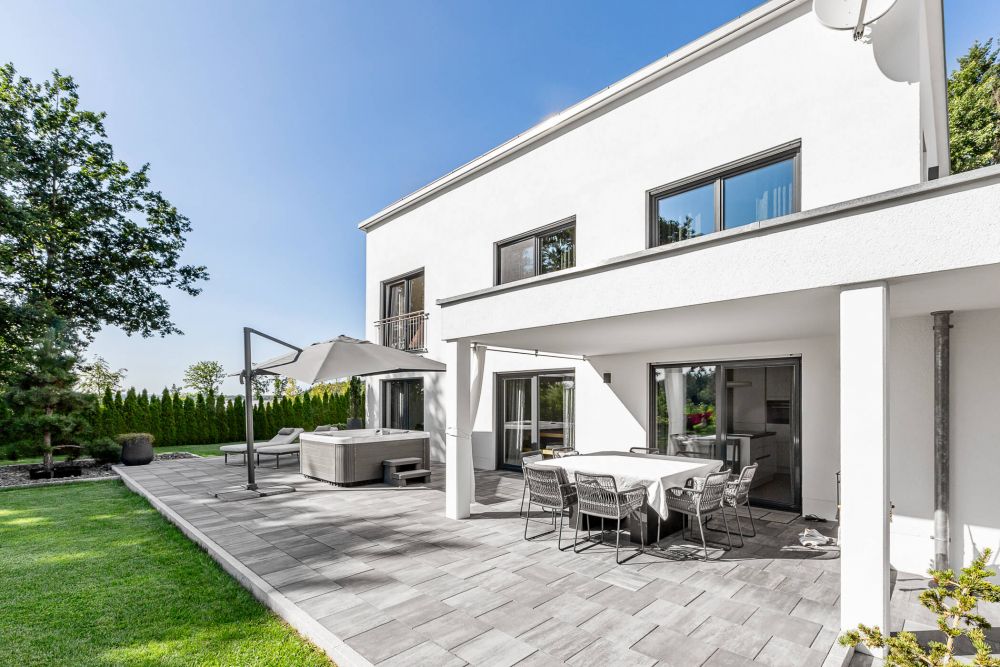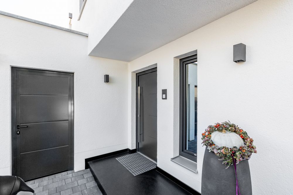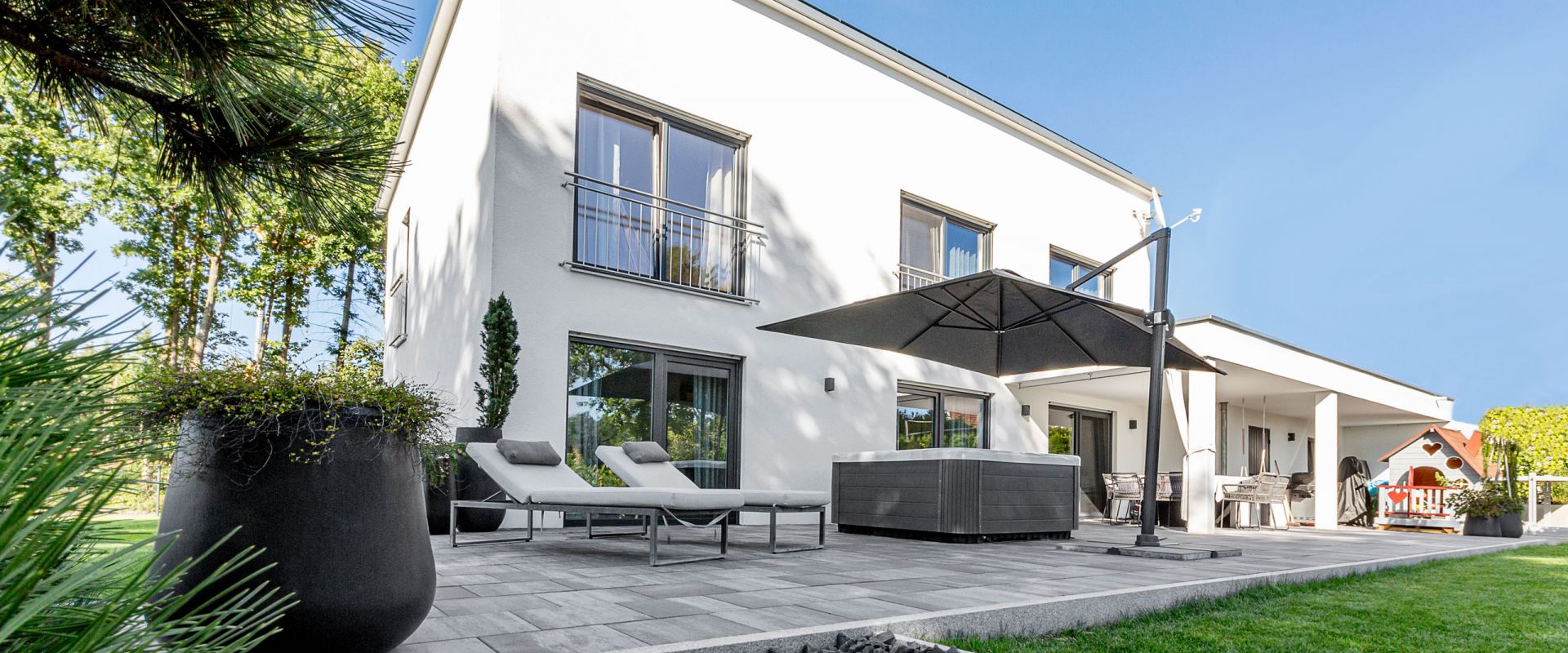 Auf der Südseite des Hauses befinden sich sowohl unten als auch oben bodentiefe Fensterelemente, die viel Tageslicht in die Räume fluten lassen. Eine großzügige, geschützte Terrasse lädt gerne zum Verweilen ein.