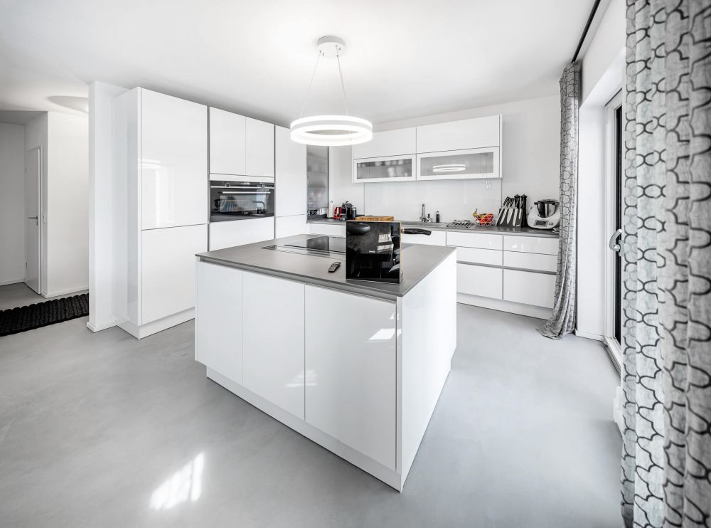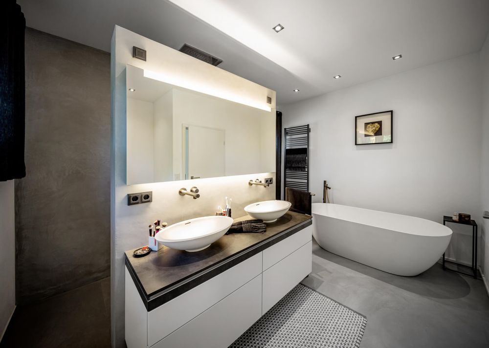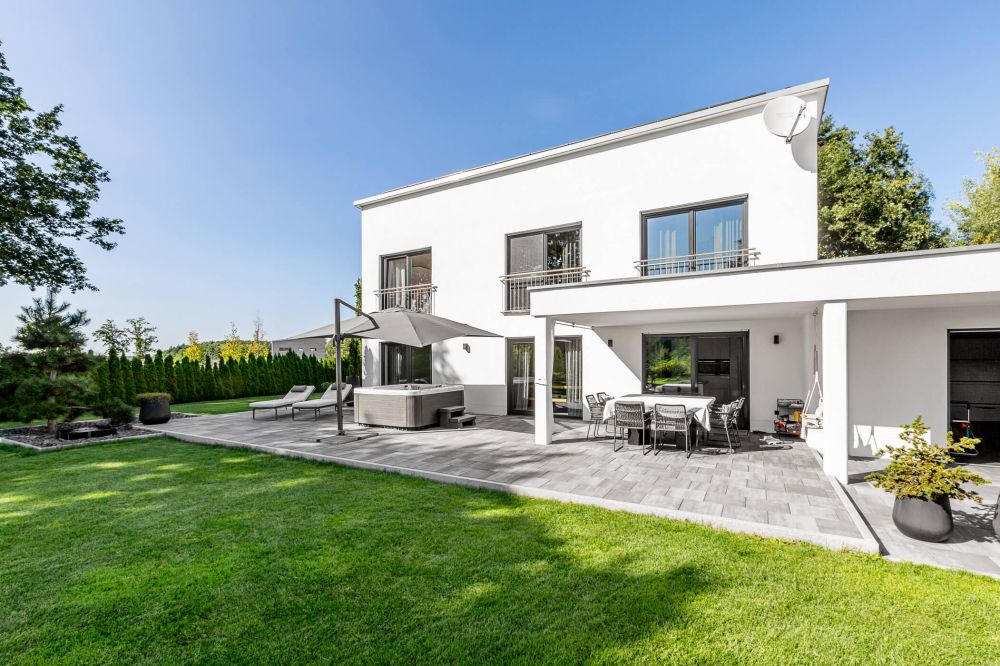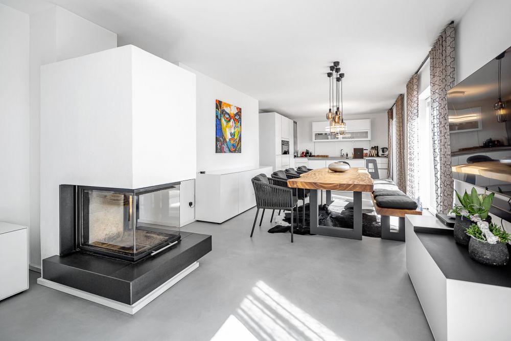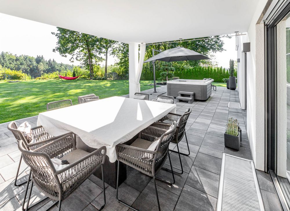 Auf der Südseite des Hauses befinden sich sowohl unten als auch oben bodentiefe Fensterelemente, die viel Tageslicht in die Räume fluten lassen. Eine großzügige, geschützte Terrasse lädt gerne zum Verweilen ein.